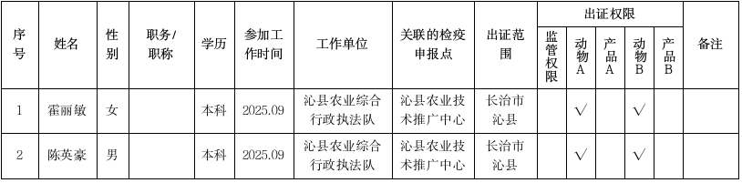 | 标题:沁县农业农村局关于拟确认官方兽医资格人员的公示 | |