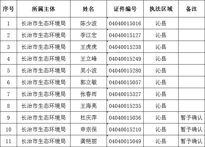依据《中华人民共和国行政处罚法》和“行政执法三项制度”关于执法信息公示的要求,现对长治市生态环境局沁县分局持有有效行政执法证件的执法人员名单予以公示。