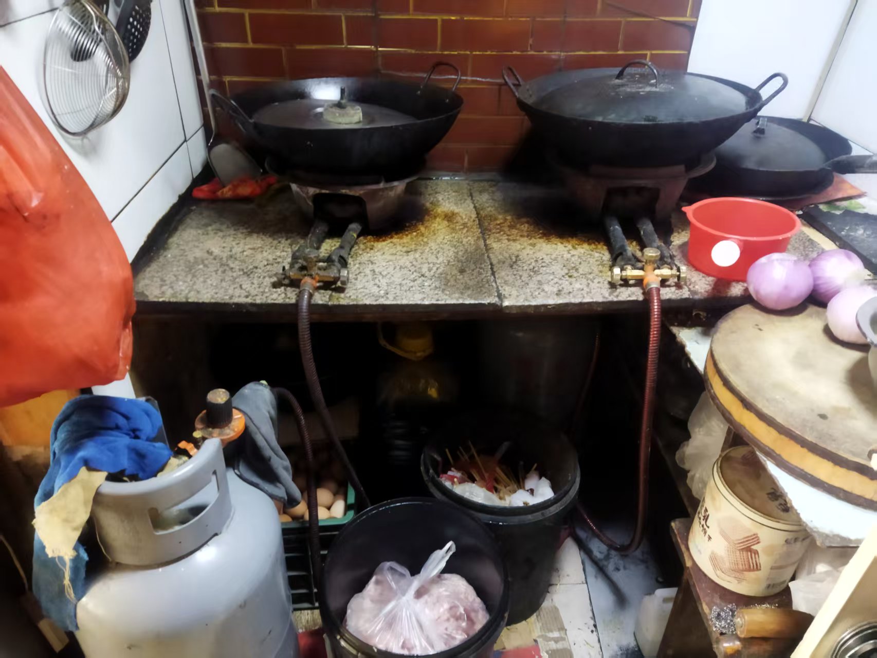 存在问题:①商品未明码标价;②厨房墙面脱落;③现场未提供健康证;④未建立进货台账;⑤用可回收无机垃圾桶浸泡粉条。