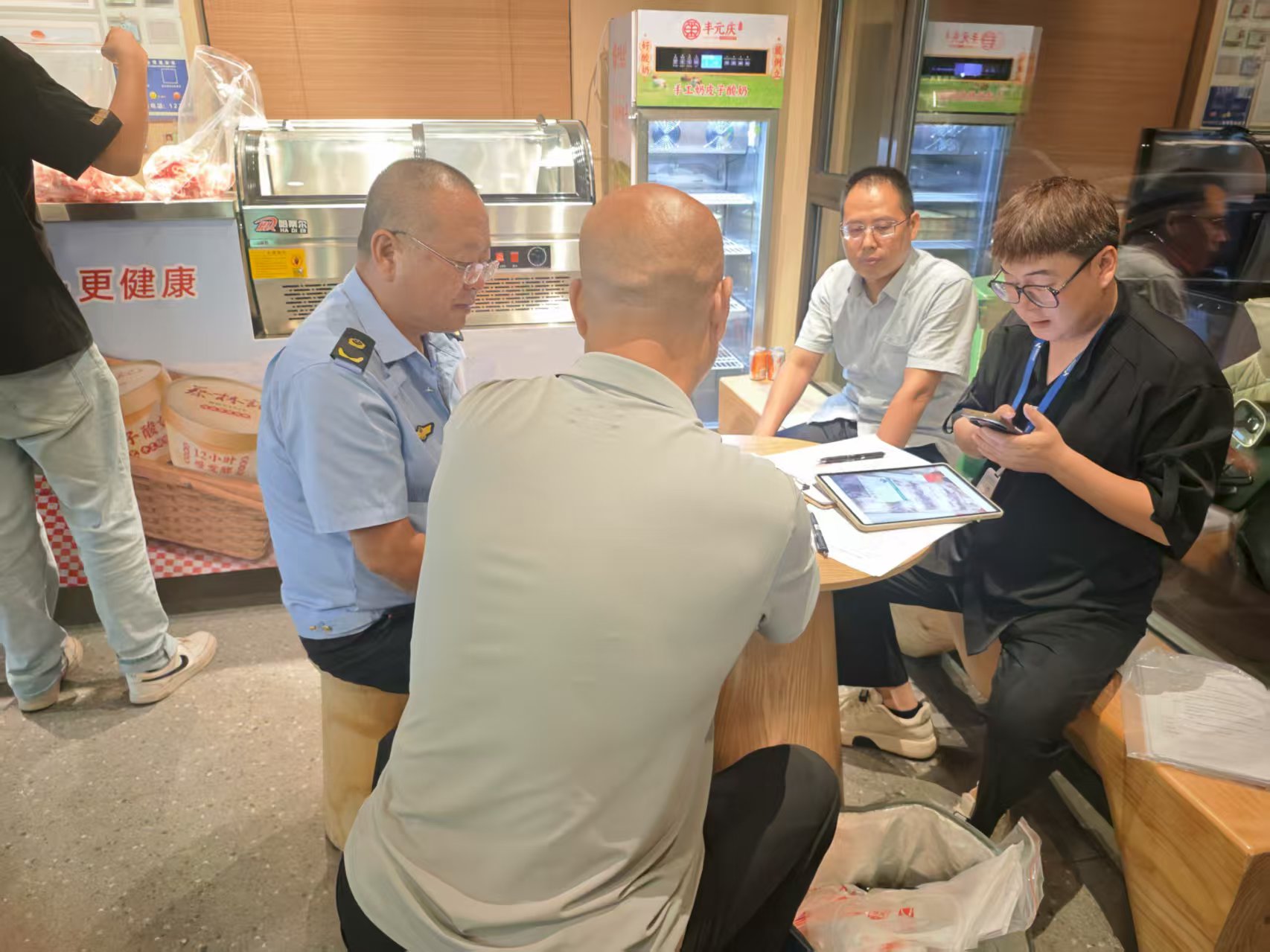 在某火锅店,执法人员现场查验该店进货台账,查看牛羊肉进货票据、供货方资质证件等资料,确保进货合规、检验合格、经营合法。