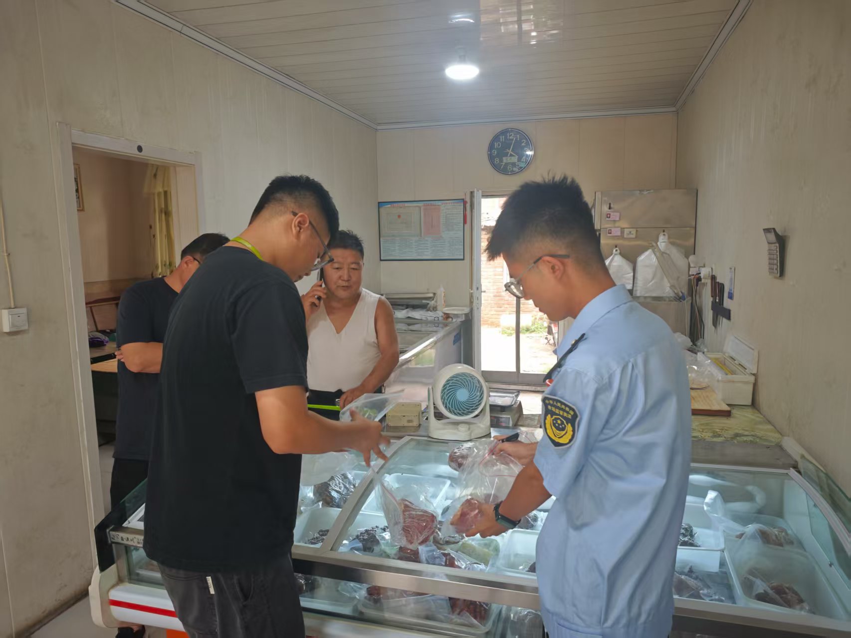 在某熟食店,执法人员现场对熟猪头肉、熟牛肉、熟驴肉制品进行检查,并对该店健康证临近过期问题进行提醒,要求及时办理,保持卫生健康的经营环境。