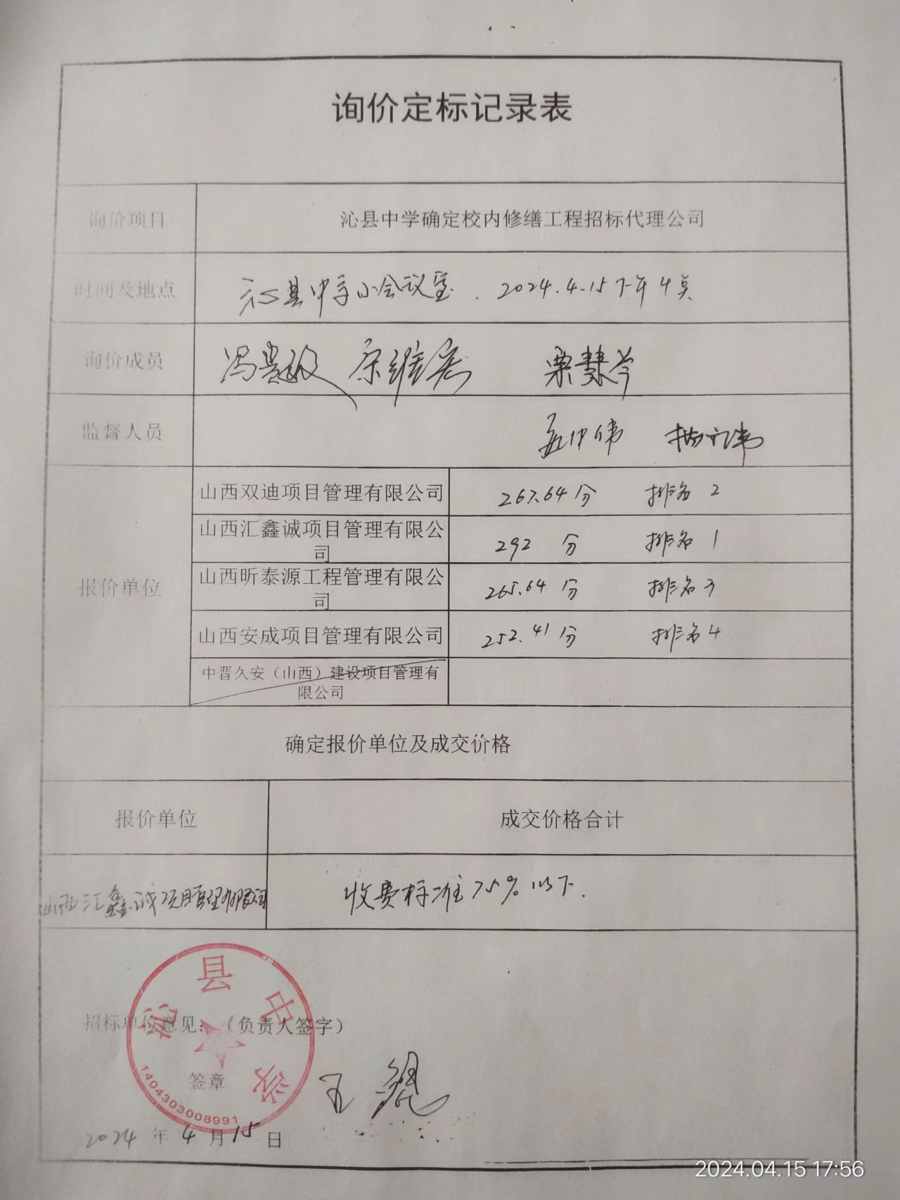 沁县中学确定校内修缮工程招标代理公司结果公告