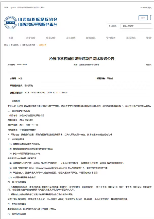 标题沁县中学校园供奶采购项目询比采购公告
