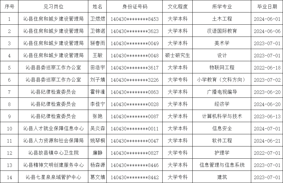 为认真贯彻落实山西省人社厅、教育厅等10部门《关于做好就业见习扩规模提质量相关工作的通知》(晋人社厅发〔2022〕31号)文件精神,经过网上公开征集就业见习岗位和招募就业见习人员,现就沁县住建局等8家单位拟录用的14名就业见习人员进行网上公示,公示时间2024年10月14日至10月18日,若认为有不符合相关政策规定或实际情况的,请在公示期内向沁县人社局反映,联系电话:7022492 联系人:王飞。