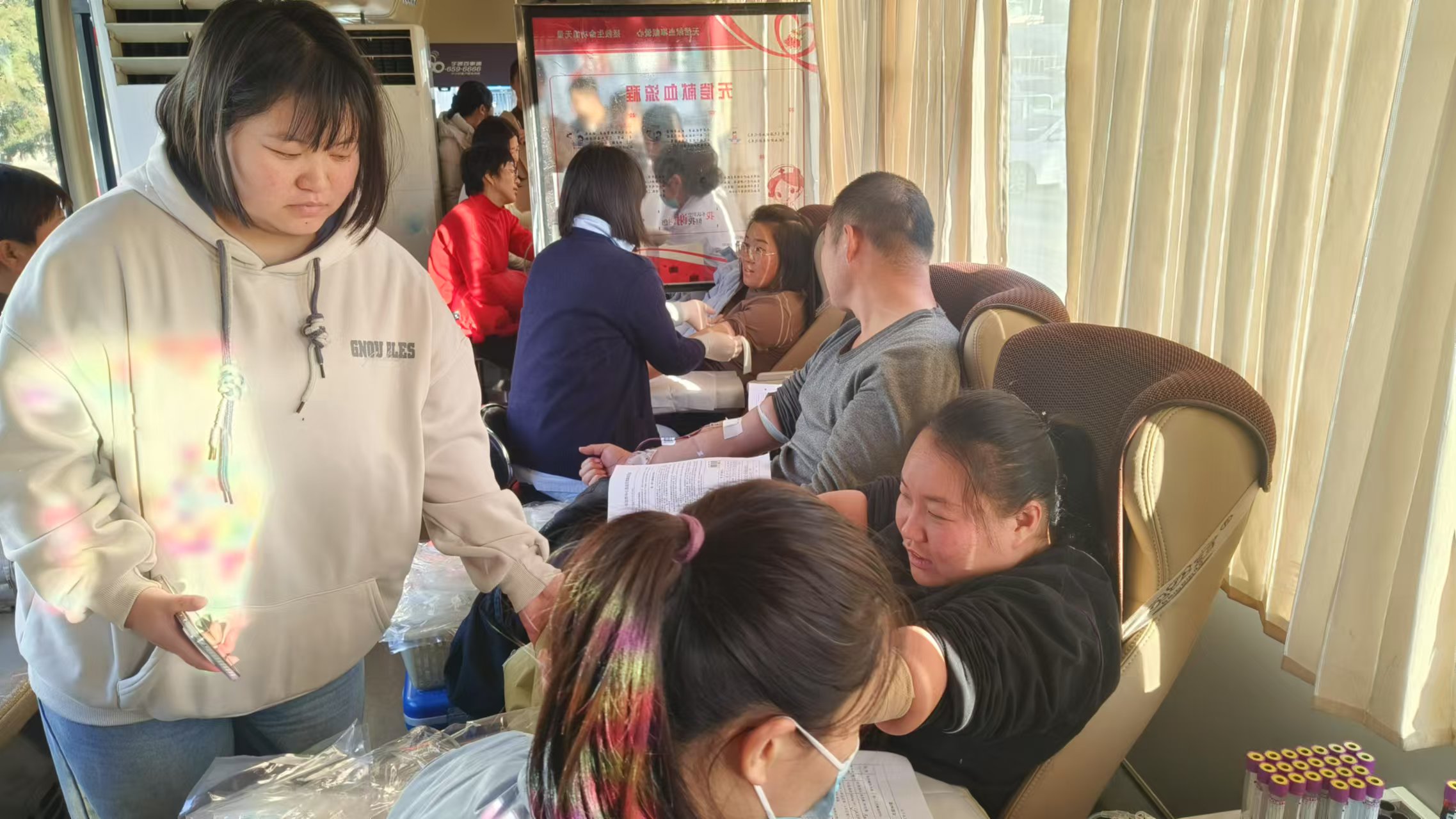 活动现场,在血站医护工作人员的引导下,大家有条不紊地进行无偿献血信息登记、血压测量、血型化验、血液检测、采血等流程。医务人员在采血的同时对献血志愿者进行献血知识科普,嘱咐献血后的注意事项。