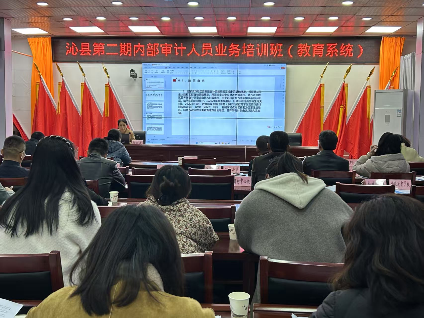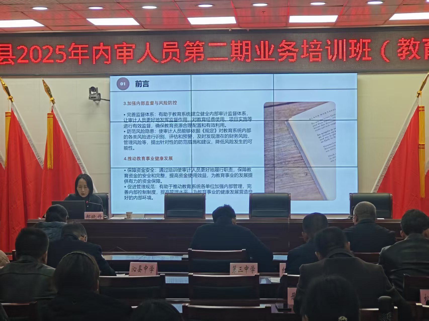 此次培训邀请县审计局和县财政局股(室)长和业务骨干人员进行授课。围绕教育系统内部审计的多个关键领域,结合工作经验和具体案例,从不同视角深入讲解了《教育系统内部审计工作规定》《行政事业单位内部控制规范(试行)》、领导人员经济责任审计实务及营养膳食补助资金审计实务等内容,帮助教育系统内审人员更新了内审理论、方法和技术,熟悉了内审工作流程和相关法律法规,提高了内审专业胜任能力。